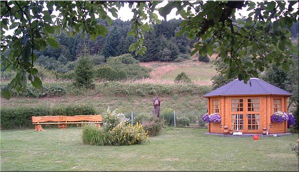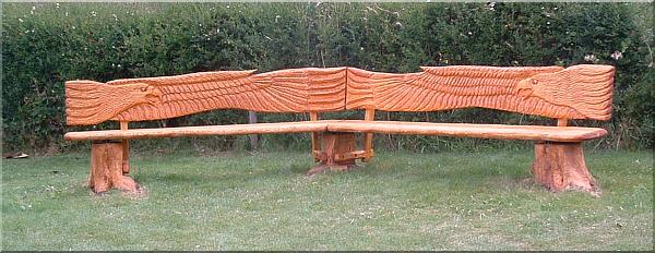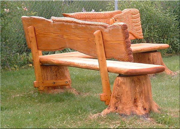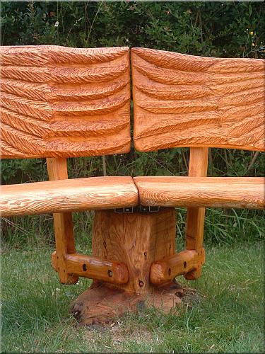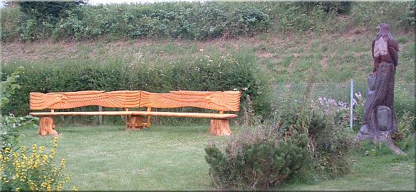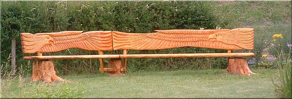 Diese Bank wurde auf drei Wurzelstöcke aufgebaut. Farbig bildet sie eine Einheit mit dem Gartenhaus. Dazwischen sitzt markant der große Adler. Um die Oberfläche der Sitzelemente nicht zu stören und um eine Belüftung der Wurzelstöcke zu ermöglichen, wurde die Bank durch eine Edelstahlkonstruktion mit den Baumstümpfen verbunden.